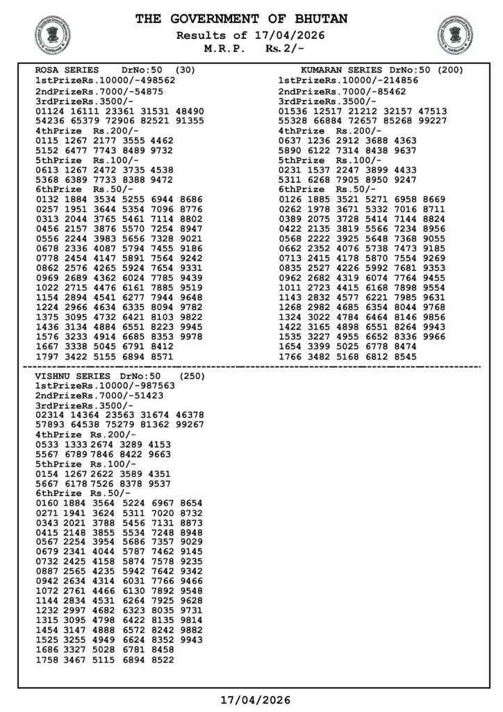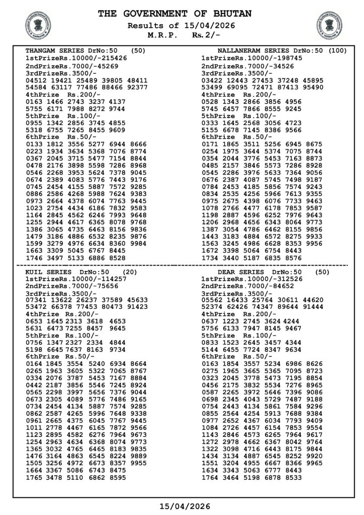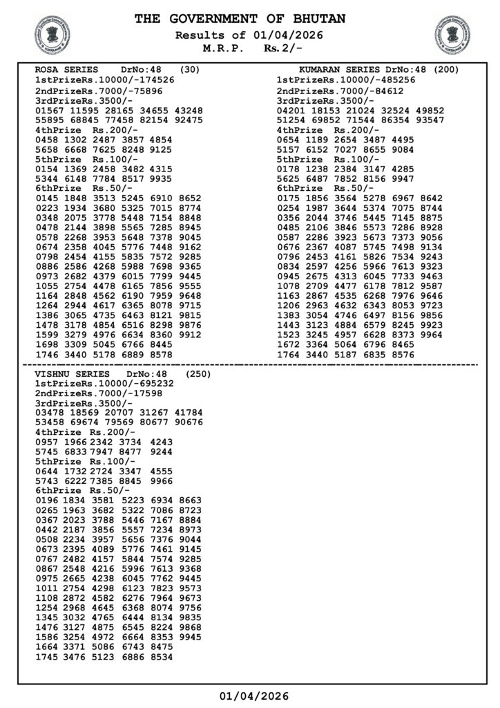 The Bhutan lottery draw usually takes place in the evening, and the official winning numbers are announced by the government. Players can verify their lottery tickets by matching their ticket numbers with the winning numbers displayed on this page.